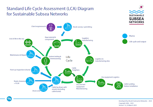 Led by Emmanuel Danjou of ASN alongside academic researchers Nicole Starosielski, Anne Pasek and Kaihui Song, the SSN Cable Working Group developed the first peer-reviewed carbon footprint for a transatlantic and transpacific subsea cable. Suppliers from across the industry have worked collaboratively with academic researchers to develop shared models. The group also developed the first standard Life Cycle Assessment Diagram of the Industry.